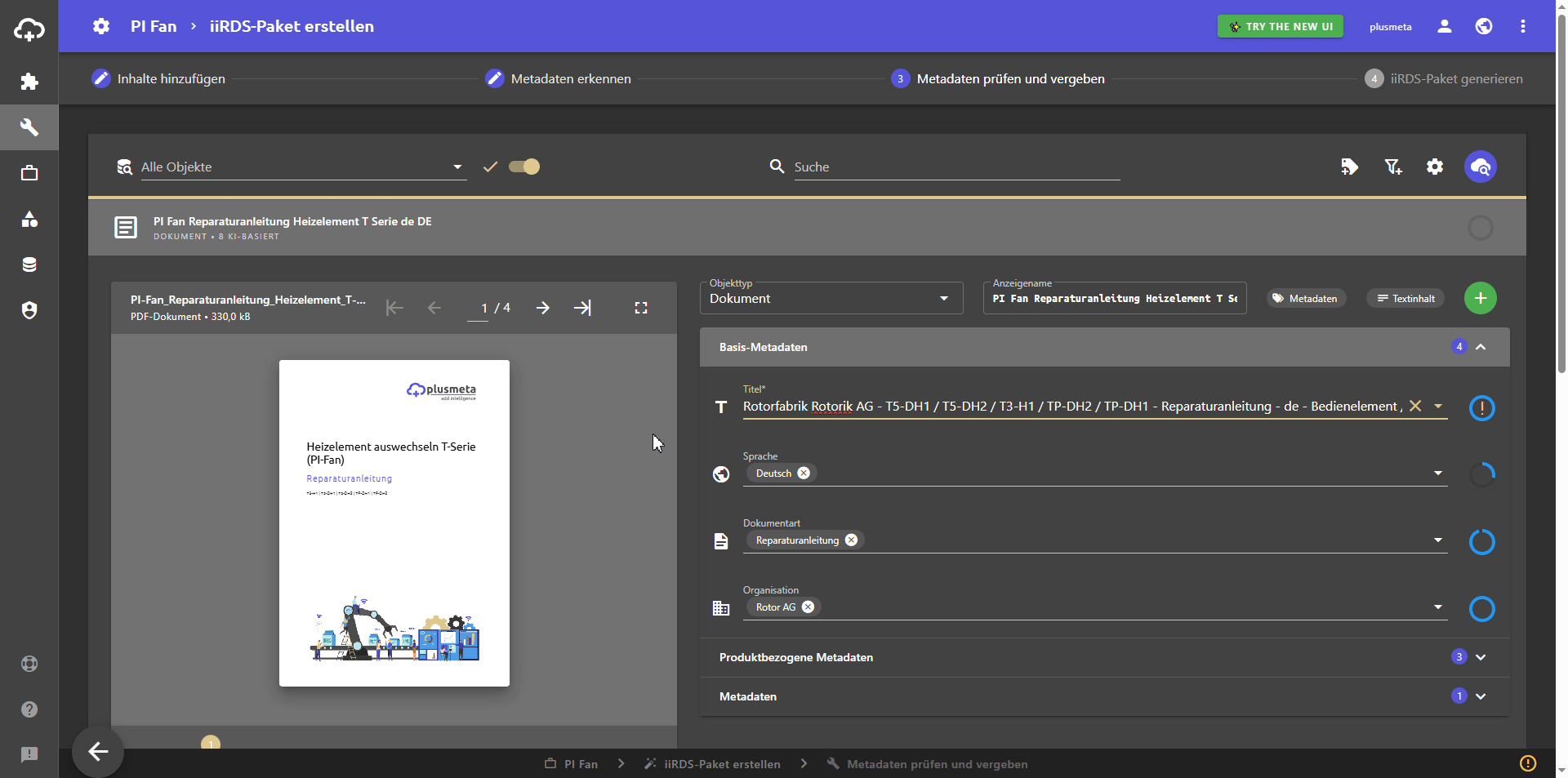 Die Detailansicht mit den erkannten Metadaten wird unterhalb des Objekts geöffnet - Die erkannten Metadaten anpassen oder ergänzen, falls die erkannten Metadaten nicht korrekt oder vollständig sind. Dazu in das entsprechende Metadatenfeld klicken.
